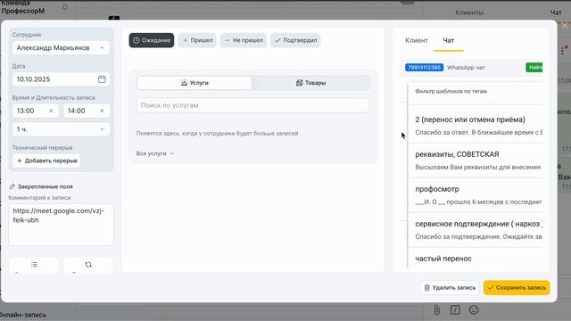 Открывайте чат прямо из карточки записи или клиента.