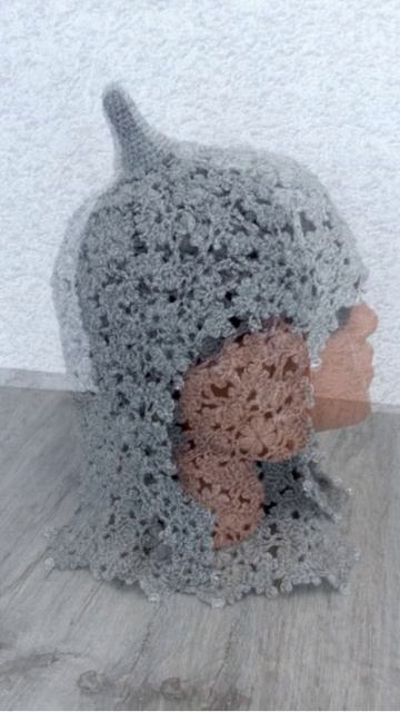 Связана крючком в светло-сером цвете украшена бусинами ввязанными в полотно.