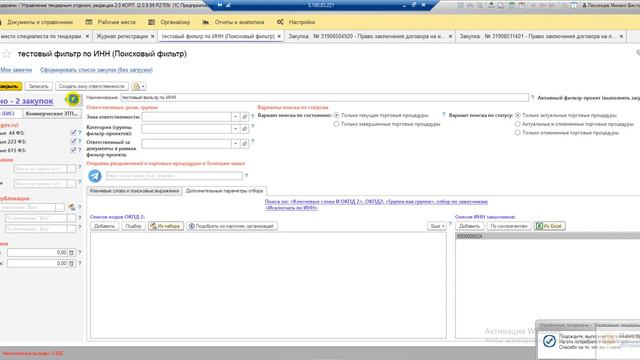 система поиска и анализа тендеров на 1С 00:30 создание поискового фильтра 02:50 проверка Искать по ИНН 09:02 проверка Исключить по ИНН