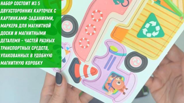 Набор состоит из 5 двухсторонних карточек с картинками-заданиями маркера для магнитной доски и магнитными деталемя - частей разных транспортных средств упакованных в удобную магнитную коробку.