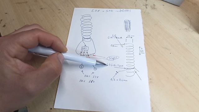 In questo video vediamo un EMP realizzato con componenti in SMD. I materiali utilizzati sono: 1 Transistor npn D882 o 2SD882 1 resistenza da 10K 2 condensatori da 33pf Rame smaltato da 0.8 o 1 mm ( per la Bobina primaria ) Rame smaltato da 0.3 o 0.4 mm ( per la Bobina secondaria ) Il circuito va alimentato con una tensione massima di 18 volt,ma non per più di 10 secondi,si rischia di bruciare il transistor D882.