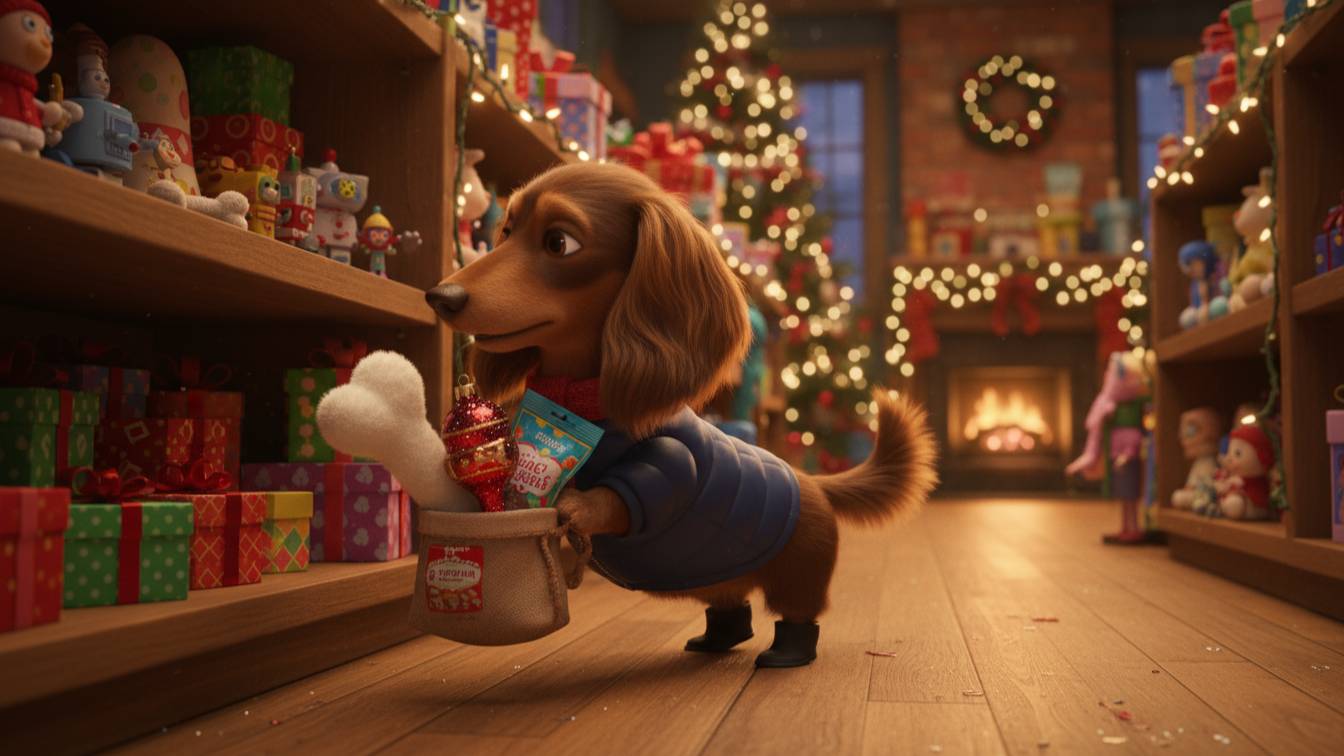Милая длинношерстная такса встречает новый год
