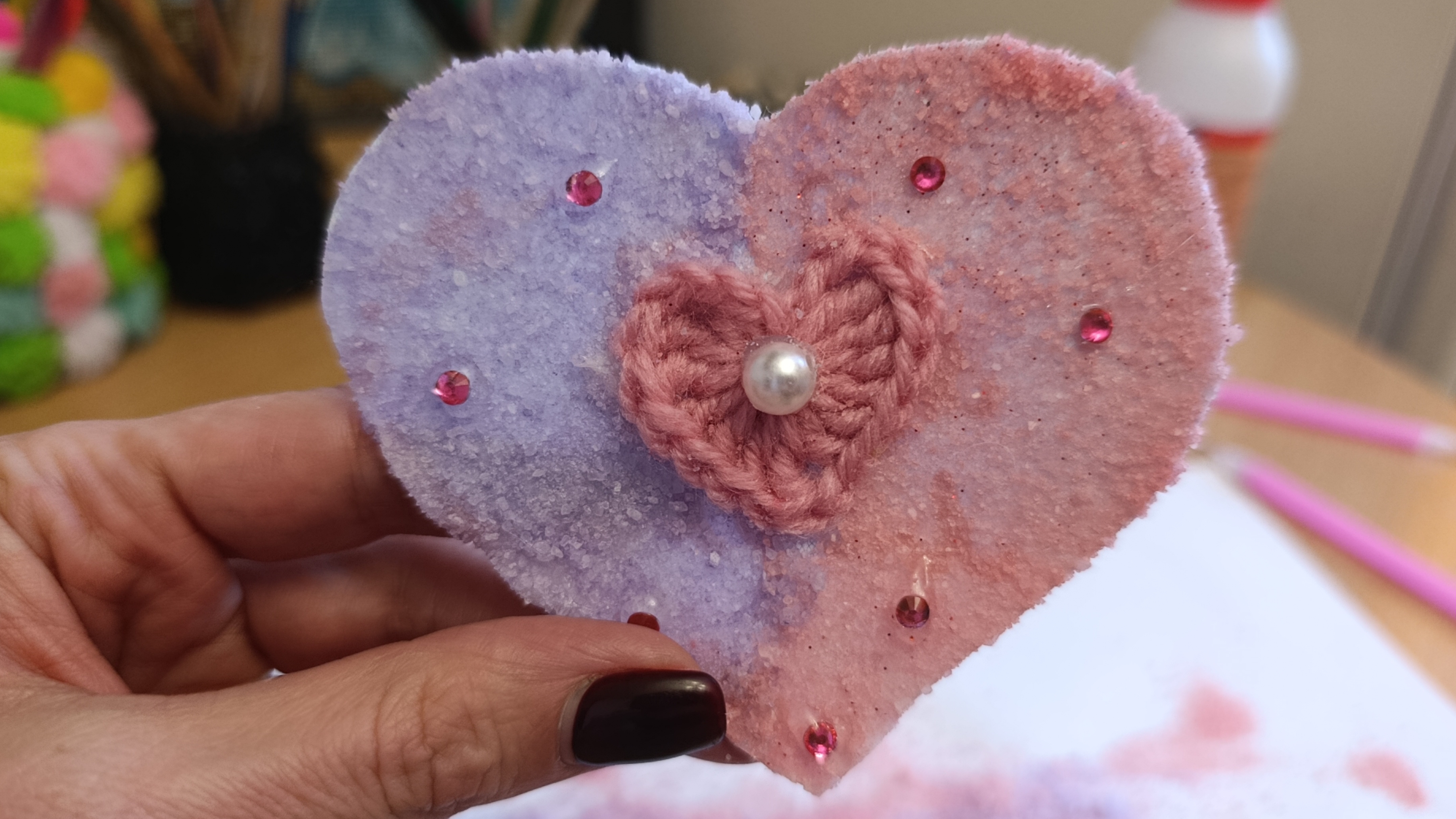 Затем приклеила вязаное сердечко.