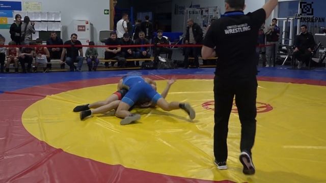 У борца в синем трико получаются и обманные действия и накаты.