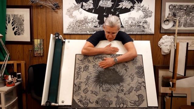Process of carving and printing the "Event Horizon" linocut by Oleg Lipchenko, May 2023. I've printed a couple of the first pri...